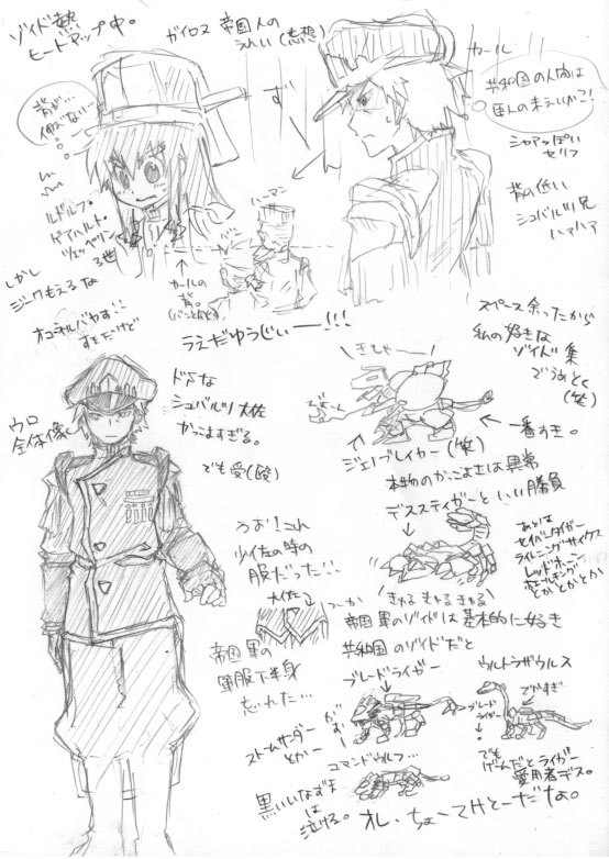 じゃなくて、 サイトの方は更新頻繁にしたい気持ちはある。 今年こそ有言実行を心がけます。 なんせつい1ヶ月前に年賀フリー絵でも用意しよう、うん!と思いいたったのに結局先日あげたらくがきしか絵を描いていなかったというアレなので。(殴られてしまえ うーん本当に用意するつもりだったんだがなぁ… 仕事は例年より断然暇だったから残業も最後の1週間くらいだけあったという、なんとも気の抜ける繁忙期だったわけだったので時間がなかったわけではないのだけどもいろいろと個人的な問題が多くて結局ラフもおこせなかった。 まぁ正月は何やっても何も言われないので描けたら後ほどうpします。 うん、描けたらね~(新年早速グダグダ空気発動) シャンパン飲みすぎた。 眠い。 寝る。 追記 因みに私からは一切年賀状出してません。 誰一人として年賀状どころかあけおめメールも出してない!イヤッホゥ! そりゃ友達減ります。 でもメンドイからこれからも年賀状は書かないに1票。(何の投票) 2007.12.30 Sun 11:03:10 らくがき最近ゾイドの1期DVD全巻を手に入れたKATIAさん宅でありますが、