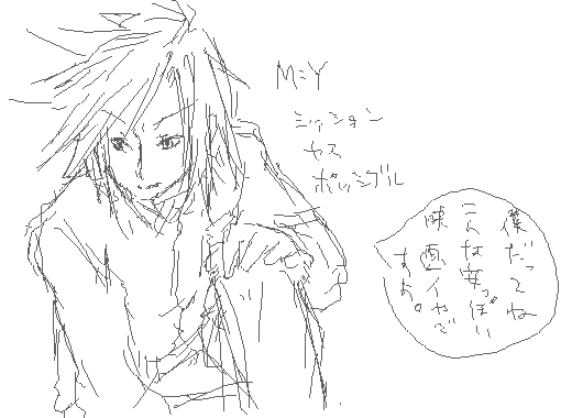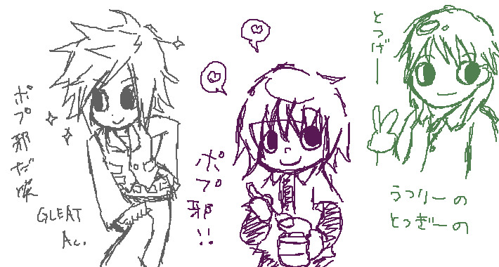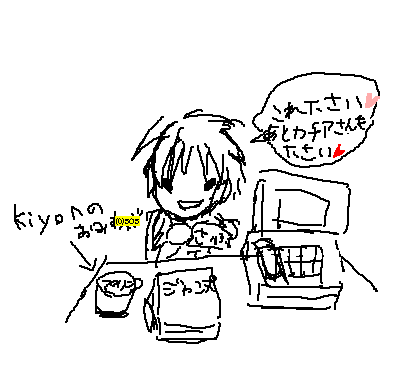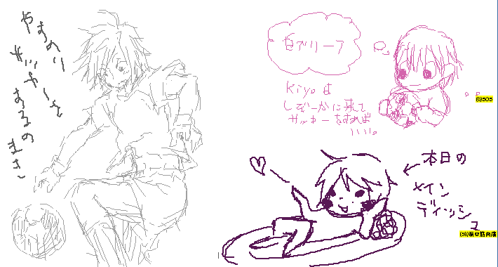 余談ですが小さい頃わたくしめは「待ちに待った」というこの言葉を「街に待った」と勘違いして「街の皆が楽しみに待つ」という間違った解釈をしておりました。 なんておばかさんなんだ。 さて本題。 先週もっそり(笑)エチャを開けてみたカチアさん。 誰も来ないよなーと半ば諦めて遊んでたら505さんがいらしてくれました。うわっほい。 その後しばらくしぞーか人な505さんとローカルネタで沸き、いつぞやかに去年のはままつ(最近改名してすえまつになったらしい/爆笑)でやすのりがうろついた駅前を一緒に徘徊しましょうという話からやすのりが入ったというミ●ストップを私が求めるあまり505さんが レジでバイトなしちゅえーしょんでやすのり描いてくださった!(´∀`) しかも台詞みて!台詞! 私がやすのりに興奮して「タダで持ってってください!ついでに私も持ってってください!」って言ったら書いてくれたの!(#´∀`#)もうマジ照れ。 イタイな自分(爽 とまたローカルネタで沸き始めたそこへ、もえさんご入室。 もえさんもしぞーか的な方なのでまたもローカルで沸く。笑 常々もえさんとしかったポプなお話もできたり。 505さんもポプ経験なされたことがあるそうで、勢い余ったカチアさんキャンバスに暴走をはじめてしまいました。 そうしたらですね・・・! ポプ邪DA――!!! ※さりげなくぐれーとのつづりが間違ってるような気がするが、確認する気にはなりませんでした(殴 ウホ!こりゃたまらん! 505さんのおかげでバリエーション増えました。ポプゆー。 そしてもえさんのきよちゃんはポプ的になってもなかじまぷりんを手放しません。 残すはかゆとしゅじ・・・! ポパーでジャンナーなそこのアナタ、「ポプな邪」描いてみない?笑 これねぇ505さん退室されたあとにもえさんと話したけど、小波にポプyasu画像送りつけて直談判したろかい。 15で出せと。爆笑。 うふふ。言い出しっぺは私ですがとてもそんな勇気はないです(・・・ そうしている間にいつの間にかテレビの話になり、世界杯の話になり。 そんな感じで描いてみたら、きよちゃんはしぞーかでサッカーすればいいとか笑 そしてどのような経緯でそうなったのか忘れたけど(たぶん私がやすのりおいしいみたいなキモイことを言ったんだと思われる)もえさんがメインディッシュに やすのり ならぬ やすもり を用意してくださった!!(鼻血 ギャー!!おみ足がとても、とても美味しそうですよ!笑 そうしてやすもりブームが訪れ、「林やす森」とか言ってるうちに 邪クスポ開催。 これの公式グッズは是非欲しい。笑 今思ったけど姉妹品が西条さんの顔だったらもっといいと思う(爆笑) そうこうする間にだべりが続き、ちょっともえさんと505さんのお話を閲覧しつつその日やってたM:i:Ⅱ的なやすのり。 M:y ミッション・yasu・ポッシブル または ミッション・安・ポッシブル 後者が有力。 安っぽそうじゃない?やすのりがやったら(殴) ※確認:KATIAはやすのりファン あとで考えたんですけどね。 H:y:31(林・保徳・31)のがよかったかなぁと・・・(・・・ エヘ。 まぁこれで今後の赤線の展開に繋がるのですが笑 それは今は言わないでおこう。(爆 ここで505さんが退室。 その後もえさんにもミッションきよポッシブルを勧めるも、M:i自体をあまりご存知ないそうだったのでロードキヨザリングを勧めてみたら エレンディルの光!まぶしいとか!爆笑 しかもよくみたら肉ソード笑 あれはどうやら非常食らしいです。 その後またポプ話で沸く。というか私が振ったのだけど。 ぽとくだったらチャイナ服だろうと描いてみた。 テーマはダサさですよ。 やすのり=ダサさじゃナーイノー?ということで。笑 裏設定で2Pにするとチャイナドレス姿になる・・・という。 実は途中まで描いてたんですが、あまりのキモさに耐え切れず諦めました笑 ま、そのうちね。笑 そんなこんなで1日目ログ終了。2日目はそのうち。 2006.07.06 Thu 23:56:23 冷めた目で僕をみないでいいないいなーしごとなんかなければなー